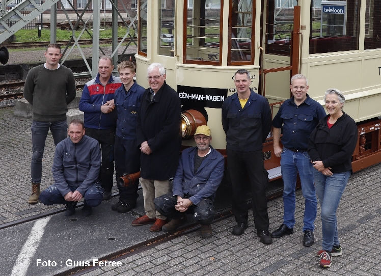 Op de foto ziet u een deel van de mensen die aan de tram hebben gewerkt in Haaksbergen bij de Museum Buurt Spoorweg Haaksbergen. De donderdag ploeg staat er niet op, evenals nog 4 personen die de laatste maanden hebben geholpen. Totaal samen met de mensen in Overloon hebben er 18 personen aan de tram gewerkt.