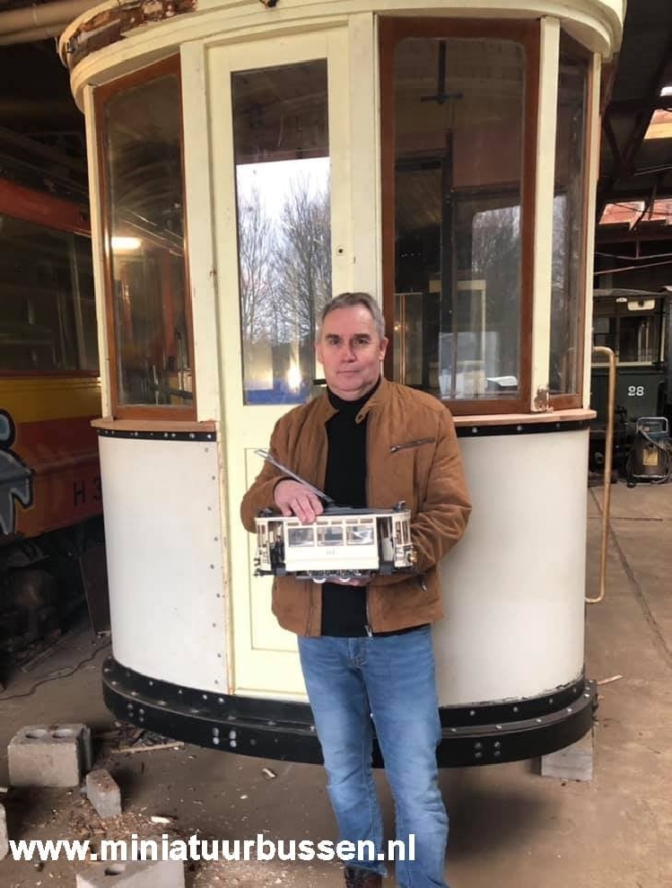 In 2020 waren Erik Kroese en Roel Ras van de werkgroep Tram 1 op bezoek bij Jos Koopmans om te praten over eventuele afbouw in Enschede. Foto: Erik Kroeze had al een model van de tram gemaakt